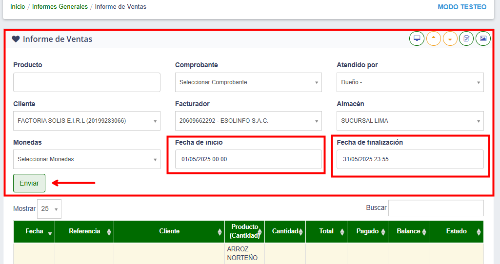Aquí podrás filtrar tu informe Por : Producto, Comprobante, Usuario - Atendido por, Cliente, Facturador, Almacén, Monedas. Todo esto en el rango de Fecha y Hora que ingreses.