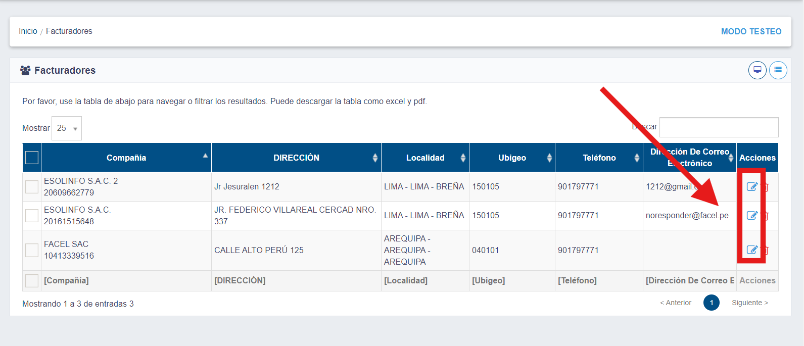 Nos muestra una lista de Facturadores, donde podemos editar cada punto.
