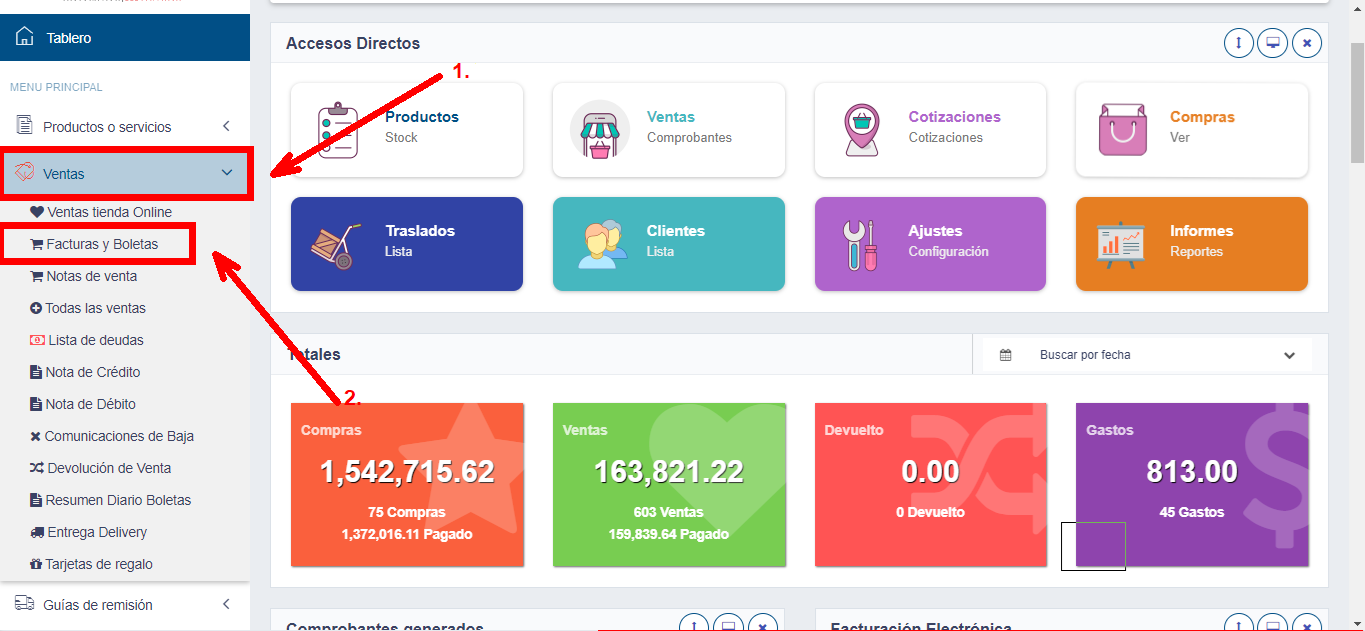 Se tendrá que ingresar al botón ventas, una vez ubicado en el botón de ventas dirigirse a Facturas Y Boletas.