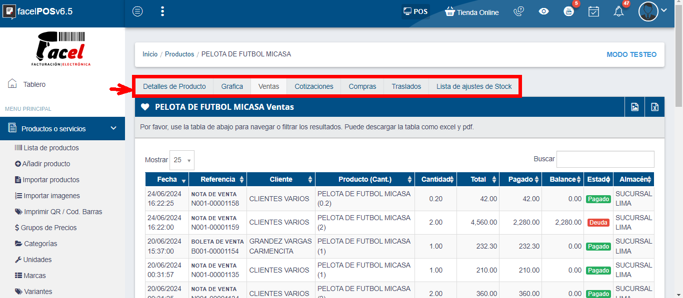En esta opción podrá visualizar todos los movimientos del producto seleccionado, como: Detalles de producto, gráfica, ventas, cotizaciones, traslados y stock.