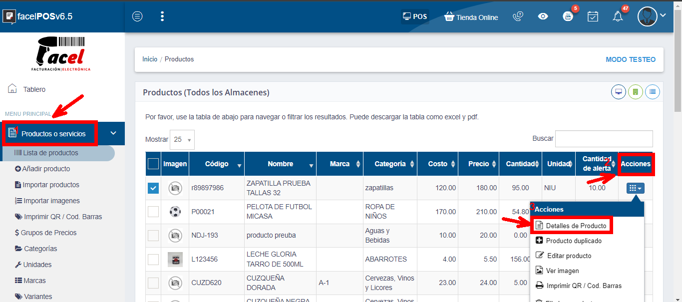 Dar clic en el módulo de productos y servicios, presionar la opción de lista de productos donde se cargarán todos los productos, seleccionar el producto, hacer clic en el botón de acciones, clic en detalles de producto.